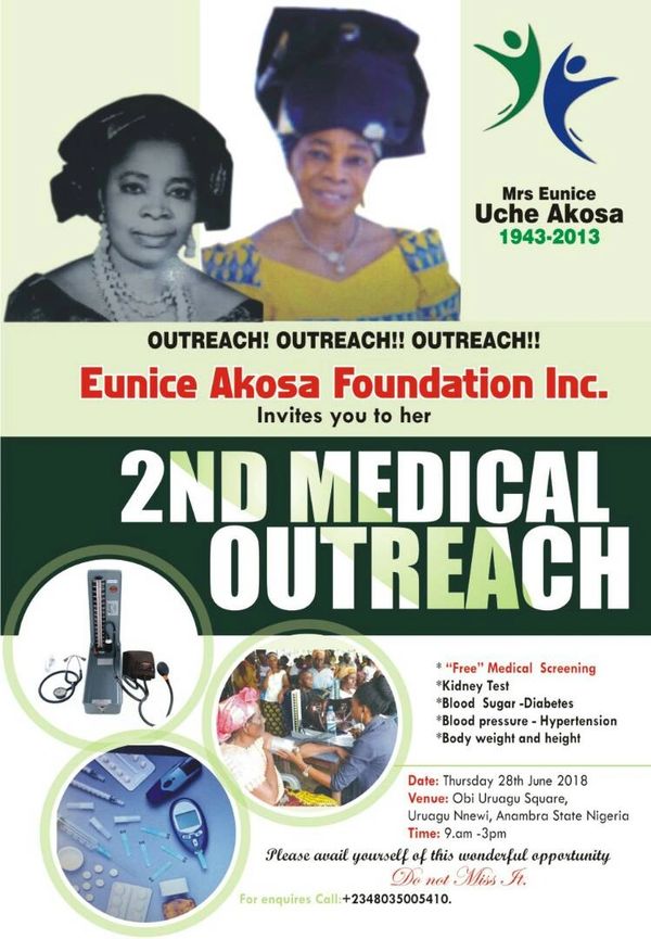 Eunice Akosa was a lady that always tried to help the less fortunate, and in her memory, her children created the Eunice Akosa Foundation- a non-for-profit organization whose goals and mission are to emulate the virtues of Eunice Akosa. This year, majority of the Akosa family from all over the world arrived Nnewi, Anambra State, Nigeria to continue the works of the late Mrs. Eunice Akosa in helping and serving the underserved. The foundation provided free medical biometric screenings, school supplies for two local primary school, and also visited a local leprosy home.